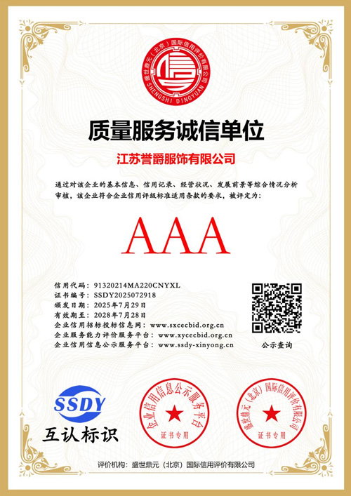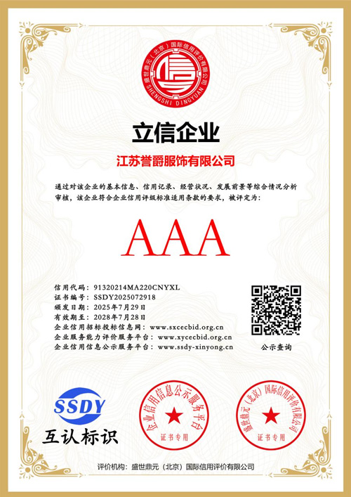 在誉爵服饰,我们相信得体的职业装不仅是工作服,更是个人专业形象和企业文化的展示。我们致力于将时尚元素与职业特性完美融合:让每一位穿着者都能展现自信与魅力。 誉爵服饰始终把客户放在首位,满足客户的各种需求,为每一位客户精心打造属于自己的个性定制职业装,让客户走在时尚的最前沿。 我们深刻理解:"独木不成林,单放不是春"。誉爵服饰始终坚持与合作伙伴共同协作,吸取合作伙伴的经验,取长补短,不断提升品牌的塑造 公司致力于通过规范、透明的企业文化和稳健、专注的发展模式,成为最受客户、投资者、员工、合作伙伴欢迎,最受社会尊重的企业